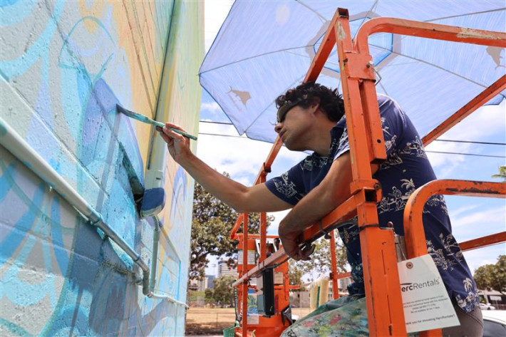 A new mural at Hālau ʻĪnana, part of the Kapaʻakea District-Wide Art Initiative by Ke Kula ‘o Kamehameha, brings Mōʻiliʻili’s story and history to life.
